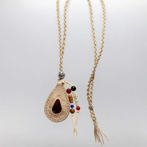 レザーの間に天然石を挟み込んで作ったペンダントトップに、編み込んだ紐を添えたペンダントです。 トップのレザー部分には模様の刻印も刻まれていて、見た目の通りとても手がこんでいます。 レザーは使っていくうちに徐々に色の変わっていく素材。 使い続けることで、あなただけの色に染まっていく様をお楽しみいただけます。 ペンダントトップ:約7.5cm ペンダント紐:約40cm お届けまでの日数:1週間以内 ※ハンドメイドのため1品ものとなります。
